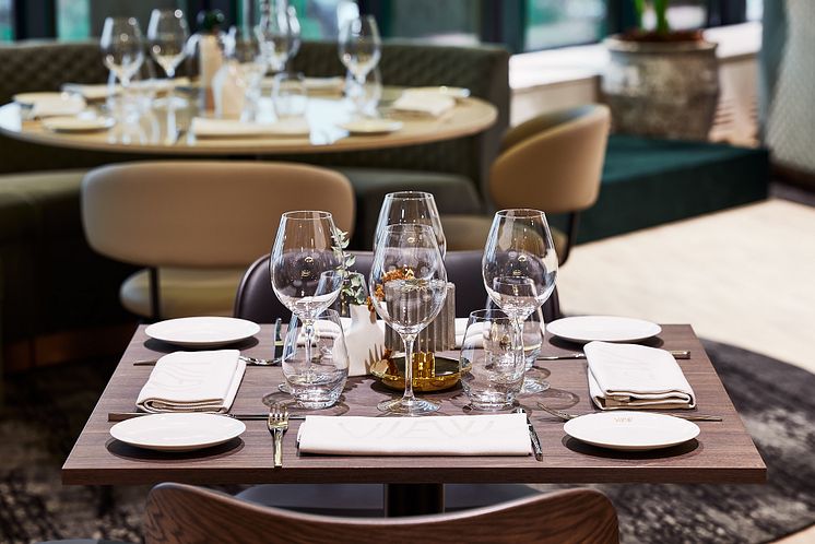 På restaurang View kan man avnjuta en lunch med lyxigare inramning och stort fokus på hållbarhet. Här möts man av en varm och inbjudande atmosfär där borden står dukade med bestick, servetter och brödkorg.