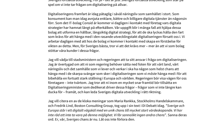 I dagens DI Debatt skriver Maria Rankka, Stockholms Handelskammare, och Fredrik Lind, Boston Consulting Group, om Europas komplicerade regleringar som bromsar digitaliseringen. Enligt deras text skulle en effektiv digitalisering av Europa till år 2020 kunna skapa över 250 000 nya jobb och därmed placera Sverige bland världens snabbast växande länder. Rankka och Lind beskriver även att medvetenheten om vikten av en framgångsrik digitalisering av Europa är låg. Digitaliseringsfrågan och den problematik som finns i ämnet är något som under en lång tid tagit upp tankarna hos Peter Hellgren, en av grundarna till och vd för det snabbväxande IT-företaget Consid. I ett öppet brev till statsminister Stefan Löfven vädjar han till regeringen att ta digitaliseringsfrågan på allvar och tillsätta en Digitaliseringsminister.