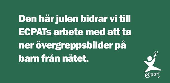 ECPAT Sverige är en barnrättsorganisation som arbetar mot sexuell exploatering av barn. Varje minut utsätts barn för hot och sexuella övergrepp på och utanför nätet. Övergrepp som oftast dokumenteras och sprids vidare. Den här julen är Consto AB med och bidrar till till att fler övergreppsbilder på barn tas ner från nätet. Så länge bilderna finns kvar – fortsätter övergreppet. Vi är stolta över att stötta ECPATS viktiga arbete för en fri värld från sexuell exploatering av barn.