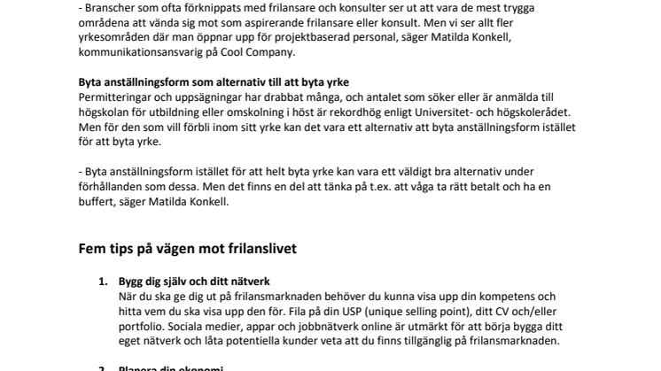 Jobba hållbart från början och planera din ekonomi är två av tipsen från Cool Company för tidigare anställda som börjar titta på frilanslivet som alternativ. Även om arbetsmarknaden har drabbats rejält av Covid-19 finns frilansyrken som står sig, bland annat för administratörer och målare.