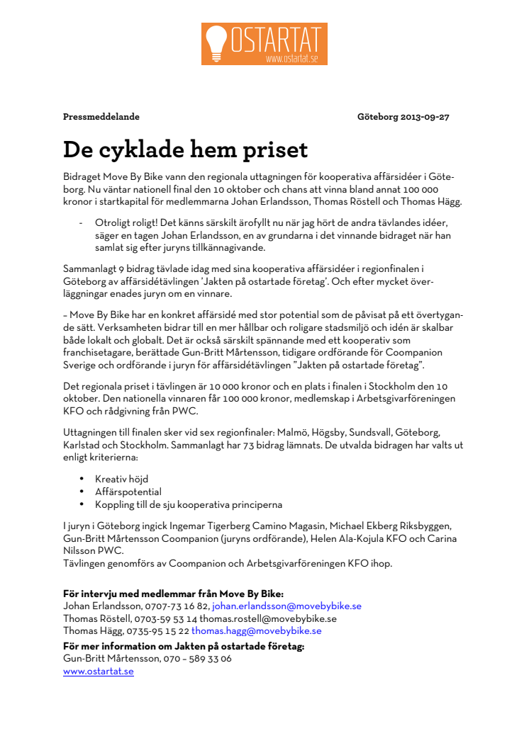 De skapar en hållbar och roligare stadsmiljö och visar att en franchise också kan göras kooperativt. På detta vann Move By Bike den regionala uttagningen för kooperativa affärsidéer i västsverige. Nu väntar nationell final och chans att vinna bland annat 100 000 kronor i startkapital för medlemmarna Johan Erlandsson, Thomas Röstell och Thomas Hägg.