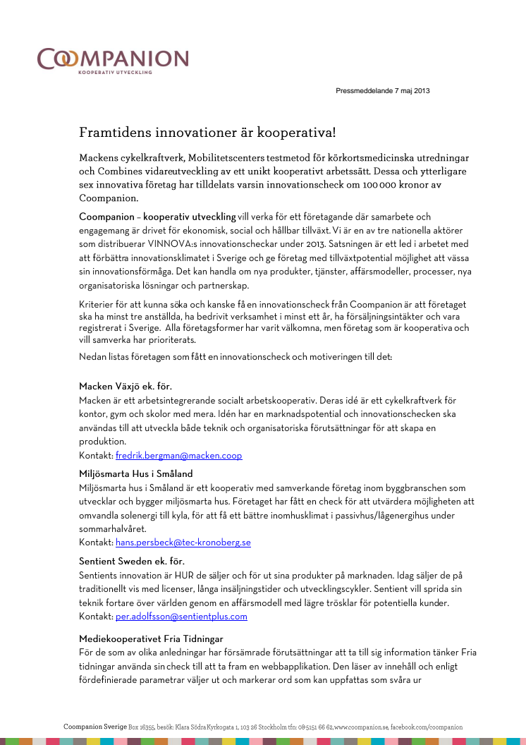 Mackens cykelkraftverk, Mobilitetscenters testmetod för körkortsmedicinska utredningar och Combines vidareutveckling av ett unikt kooperativt arbetssätt. Dessa och ytterligare sex innovativa företag har tilldelats varsin innovationscheck om 100 000 kronor av Coompanion. Alla företagsformer har varit välkomna att söka en check, men företag som är kooperativa och vill samverka har prioriterats.