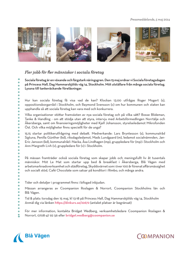 För mer information, kontakta Bridget Wedberg, verksamhetsledare Coompanion Roslagen & Norrort, 0708-47 92 56 eller bridget.wedberg@coompanion.se