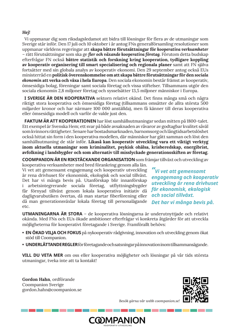 Coompanions nationella anslag har minskats med drygt en tredjedel sedan 2015, dvs tvärtemot vad FNs och EUs kraftfulla resolutioner påvisar. Coompanion kan, om politiken så vill, i än högre grad medverka till måluppfyllelse av Agenda 2030 och med kooperativa förtecken bidra till att lösa de samhällsutmaningar vi ser idag. Men då behövs en ökad vilja och fokus på nykooperativ rådgivning, innovation och utveckling genom ökat stöd till Coompanion liksom underlättande regler för företagande och satsningar på innovation inom tillsammansägande.