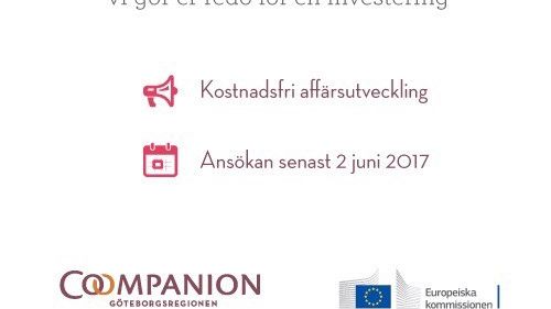 Coompanion är företagsrådgivaren för alla som vill starta och utveckla demokratiskt ägda och styrda företag – kooperativ. Vi erbjuder kostnadsfri rådgivning om affärsidén, samarbetet och allt som behövs för start och utveckling. Det finns minst Coompanion i varje län i Sverige. Varje regionalt Coompanion runt om i landet ägs och styrs lokalt av sina medlemsorganisationer. Rådgivning är kostnadsfri och finansieras av Tillväxtverket och regionala/lokala aktörer. I Göteborgsregionen är dessa Västra Götalandsregionen, Business Region Göteborg och medlemmar från etablerad kooperation.