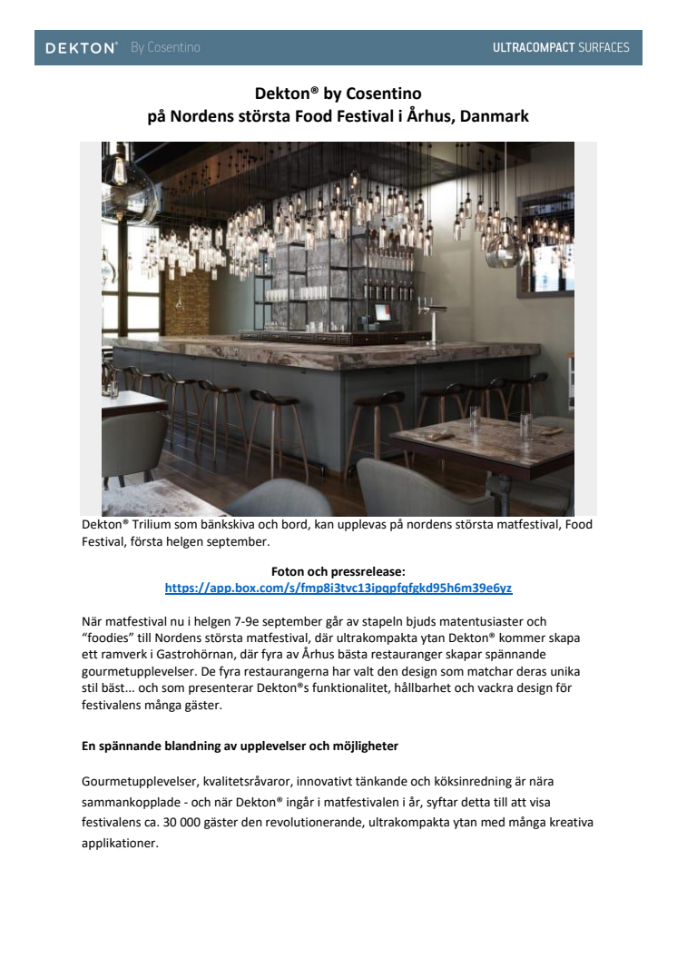 Matfestival nu i helgen 7-9e september där matentusiaster och “foodies” bjuds till Nordens största matfestival. Ultrakompakta ytan Dekton® kommer skapa ett ramverk i Gastrohörnan, där 4 av Århus bästa restauranger skapar spännande gourmetupplevelser. De 4 restaurangerna har valt den design som matchar deras unika stil bäst och som presenterar Dekton®s funktionalitet, hållbarhet och vackra design.