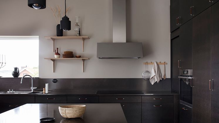 Alice berättar vidare: Fläkten heter Aero och kommer från Fjäråskupan. Redan i de första köksskisserna var fläkten vald, den var liksom ett givet inslag i köket med dess rena och raka linjer.