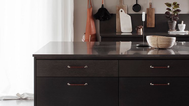 När det kommer till valet av handtag, var det också redan förutbestämt. Jag hade sedan länge varit förtjust i dessa läderlindade från Beslag Design och det bruna skinnet gör att köket upplevs ”snällare” på något vis. Det mjuka intrycket förstärks. Likaså gör de övriga trä-inslagen köket mera hemtrevligt och ombonat, trähyllorna och knopplisterna är från Norrgavel.