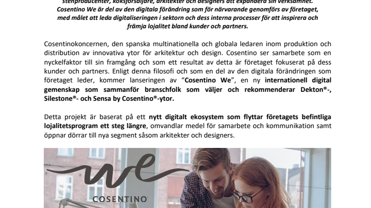 Cosentino ser samarbete som en nyckelfaktor till sin framgång och som ett resultat av detta är företaget fokuserat på dess kunder och partners. Enligt denna filosofi och som en del av den digitala förändringen som företaget leder, kommer lanseringen av “Cosentino We”, en ny internationell digital gemenskap som sammanför branschfolk som väljer och rekommenderar Dekton®-, Silestone®- och Sensa by Cosentino®-ytor.