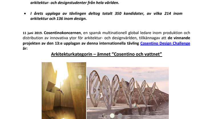 Cosentinokoncernen, en spansk multinationell global ledare inom produktion och distribution av innovativa ytor för arkitektur- och designvärlden, tillkännagav att de vinnande projekten av den 13:e upplagan av denna internationella tävling Cosentino Design Challenge är: