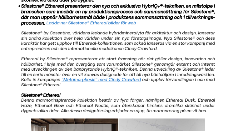 Silestone® by Cosentino, världens ledande hybridmineralyta för arkitektur och design, lanserar sin andra kollektion över hela världen under sin nya företagsimage. Nya Silestone® och dess karaktär har gett upphov till Ethereal-kollektionen, som också lanseras via en stor kampanj med entreprenören och den internationella modeikonen Cindy Crawford.