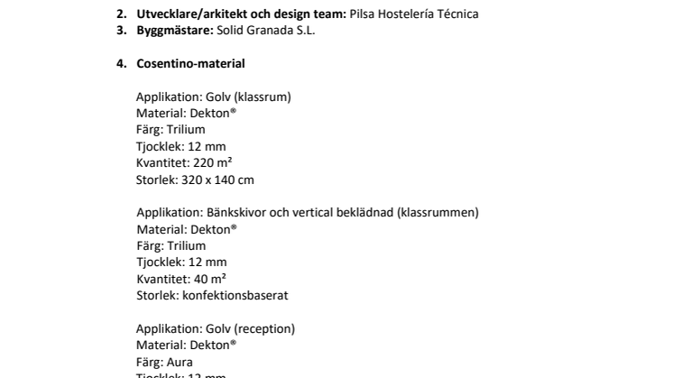 Om Cosentino Group är ett globalt familjeföretag som tillverkar och distribuerar högkvalitativa, innovativa ytor för arkitektur och design. Som marknadsledande företag arbetar Cosentino tillsammans med sina kunder och partners för att skapa designlösningar som ger mervärde och inspiration i vardagen med de banbrytande varumärkena Dekton®, Silestone® och Sensa by Cosentino®, som alla är ledande inom kategorierna kvarts-, ultrakompakta- och återvunna ytor. Företagets utveckling och framgång baseras på internationell expansion, innovativ forskning och utveckling, respekt för miljön och hållbarhet samt lokalt engagemang i utbildning, jämställdhet och arbetsmiljö där företaget finns. Cosentino Group distribuerar idag sina produkter och varumärken till mer än 80 länder och förvaltar sin närvaro direkt från huvudkontoret i Almeria, Spanien i 32 länder och från de egna anläggningarna i över 29 länder. Koncernen har sju fabriker (sex i Spanien och en i Brasilien), en intelligent logistikplattform i Spanien och mer än 120 kommersiella och affärsenheter över hela världen. Över 90 procent av Cosentino Groups omsättning kommer från internationella marknader.