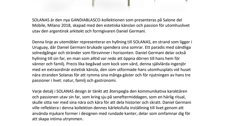 SOLANAS är den nya GANDIABLASCO-kollektionen som presenteras på Salone del Mobile, Milano 2018, skapad med den estetiska känslan och passion för utomhuslivet utav den argentinsk arkitekt och formgivaren Daniel Germani.
