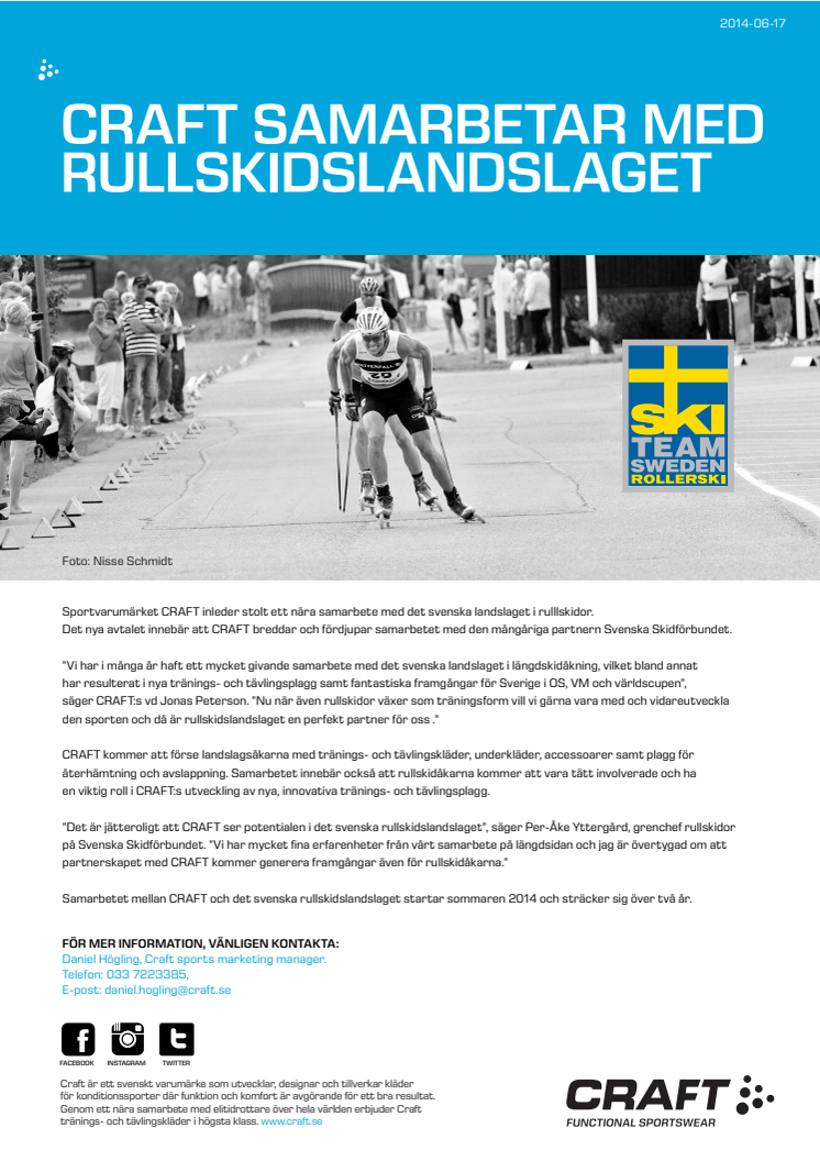 Sportvarumärket Craft Sportswear inleder stolt ett nära samarbete med det svenska landslaget i rulllskidor. Det nya avtalet innebär att Craft breddar och fördjupar samarbetet med den mångåriga partnern Svenska Skidförbundet.
