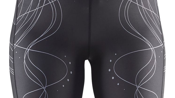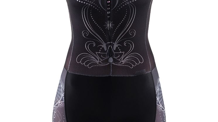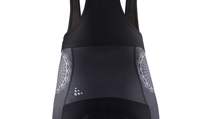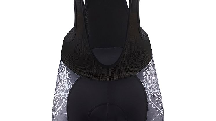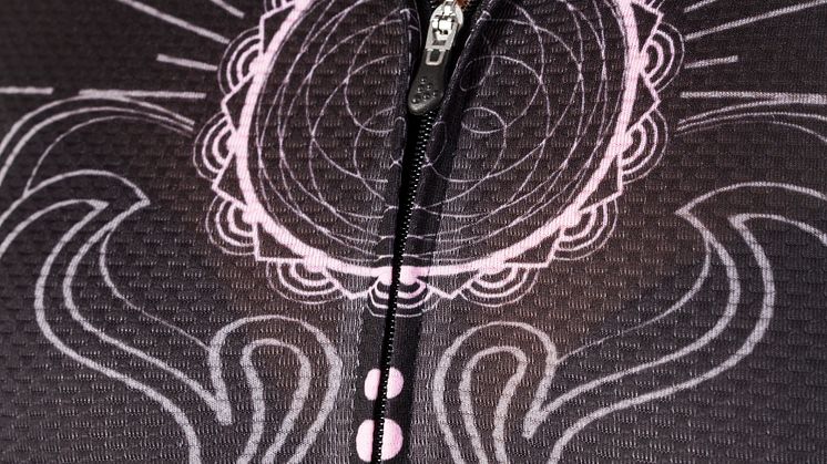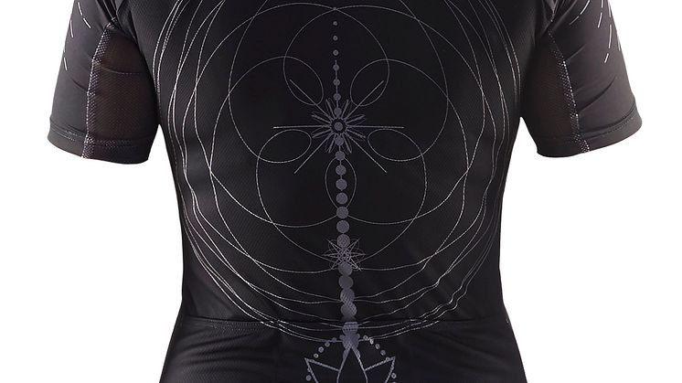 På cykeltröjan följer printet ryggkotorna ner till svanken där det strömmar ut och slår ut i en sol.