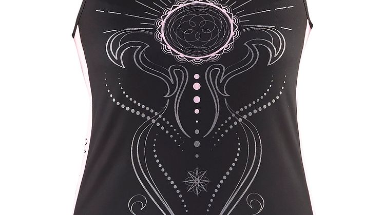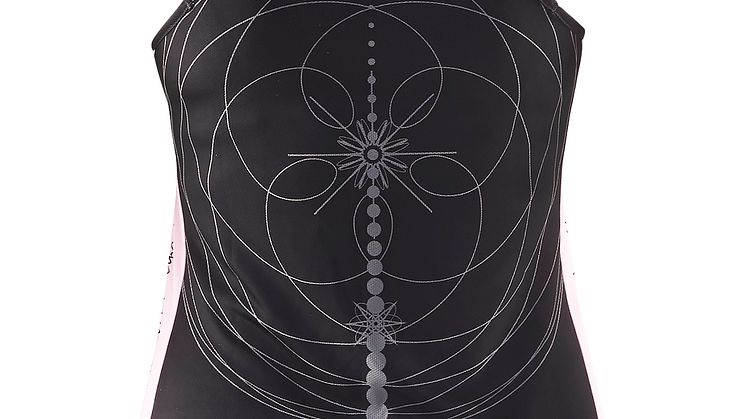 I sporttoppen går printet som ett halsband runt halsen, med inspiration från både sport och Oskarsgala. De feminina inslagen har varit viktiga i designen som andas styrka och femininitet.