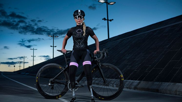 Shahrzad som förlorade båda sina underben i en sjukdom för några år sedan tävlar idag i triathlon. Första gången hon bar sin nya kollektion ”I am my own superhero” var på Stockholm triathlon i somras.