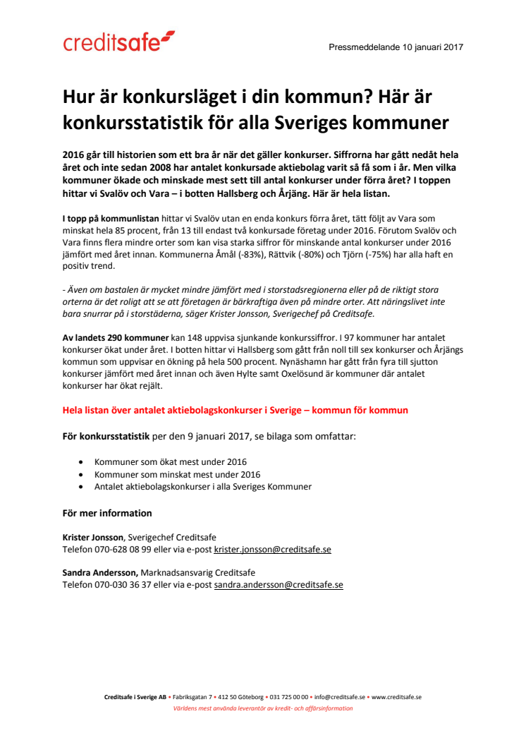 2016 går till historien som ett bra år när det gäller konkurser. Siffrorna har gått nedåt hela året och inte sedan 2008 har antalet konkursade aktiebolag varit så få som i år. Men vilka kommuner ökade och minskade mest sett till antal konkurser under förra året? I toppen hittar vi Svalöv och Vara – i botten Hallsberg och Årjäng. Här är hela listan.