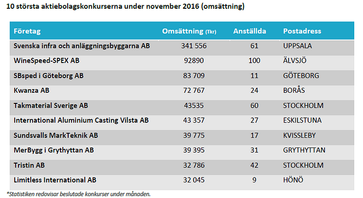 10 största aktiebolagskonkurserna under november 2016 (omsättning)