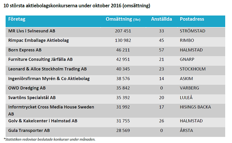 10 största aktiebolagskonkurserna under oktober 2016 (omsättning)