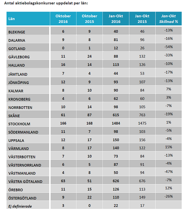Antal aktiebolagskonkurser uppdelat per län i oktober