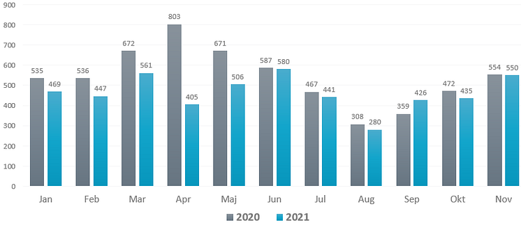 Antalet konkurser på aktiebolag per månad under 2021 och 2020