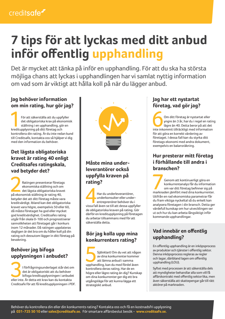 Behöver du intyga att du är kreditvärdig i samband med en upphandling? Kontakta Creditsafe och få en gratis kreditupplysning på sales@creditsafe.se eller 031-725 50 10.