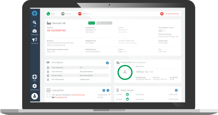 Med Sales Joe får företag obegränsad tillgång till över 1.1 miljoner kontaktpersoner på 1.6 miljoner svenska företag. Det gör det möjligt för säljteam att få en fullständig översikt över kampanjer, säljpipe, affärsmöjligheter, försäljningar och resultat, både på individ- och teamnivå. Verktyget ger möjligheten att segmentera fram de bästa leadsen genom exempelvis bransch, geografi, riskfaktor, antal anställda och omsättning.