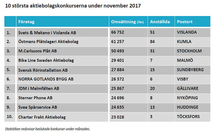 10 största aktiebolagskonkurserna under november 2017