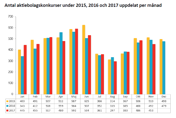 - Antal aktiebolagskonkurser under 2015, 2016 och 2017 uppdelat per månad