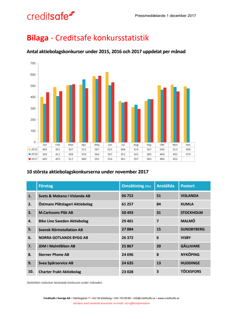 För konkursstatistik per den 1 december 2017, se bilaga som omfattar: