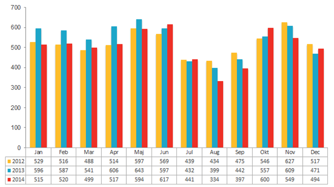 - Antal aktiebolagskonkurser under 2012, 2013 och 2014 uppdelat per månad