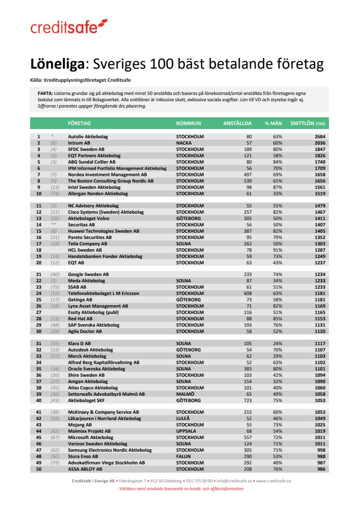 Första platsen intar internationella trafiksäkerhetsföretaget Autoliv Aktiebolag. De betalar sina medarbetare bäst i Sverige med en genomsnittlig årslön på 2,6 miljoner kronor. Det betyder en månadslön på 223 000 kronor. Tvåa på listan är kredithanteringsbolaget Intrum AB med en snittårslön på 2 miljoner kronor till sina 57 anställda. På plats tre finns mjukvaruföretaget SFDC Sweden AB (Salesforce) med 1,8 miljoner i årslön.