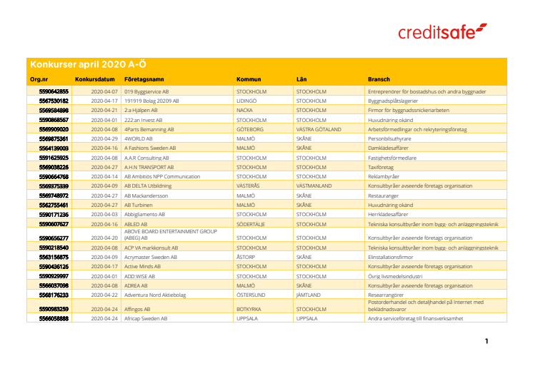 Antal inledda företagsrekonstruktioner under aprilmånad noterades till 55 stycken, en ökning med 175%. I listan kan vi se företagsnamn som flygbolaget BRA Sverige AB, sportkedjorna Intersport AB och Löplabbetgruppen AB samt den den anrika herrekiperingen i Göteborg, Holmens Herr Aktiebolag.