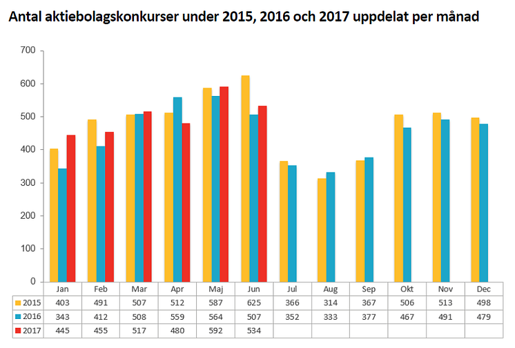 - Antal aktiebolagskonkurser under 2015, 2016 och 2017 uppdelat per månad