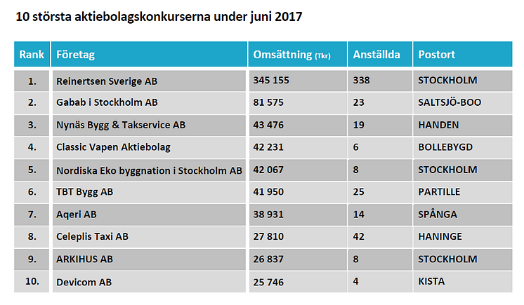 Den största konkursen sett till både omsättning och antal anställda är konsult- och entreprenadföretaget Reinertsen Sverige AB. Även moderbolaget i Norge försattes i konkurs tidigare i år. Dotterbolaget i Sverige hade enligt det senaste bokslutet en omsättning på 345 miljoner och 338 anställda. Samtliga aktiebolag som gick i konkurs under juni drabbade totalt 1 387 anställda. 30 av de konkursade aktiebolagen hade tio eller fler anställda.