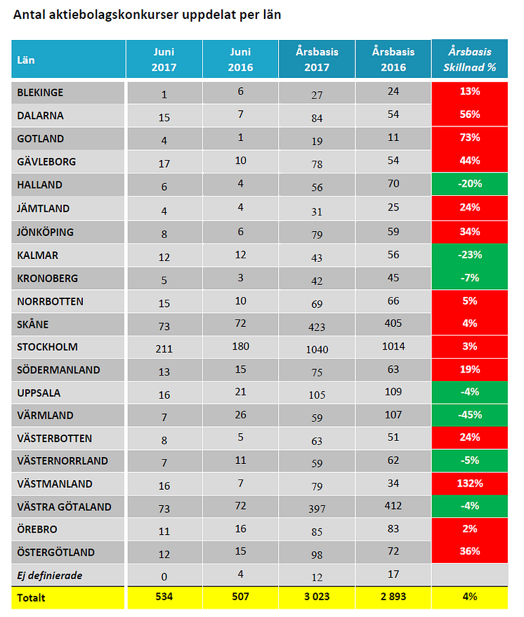 Totalt har 3 023 aktiebolag gått i konkurs i Sverige hittills i år. Det är en ökning på fyra procent jämfört med förra året. Sett till årets första sex månader så har konkurserna ökat alla månader förutom april. Även sett till län så uppvisar 14 av 21 län en ökning under det första halvåret.