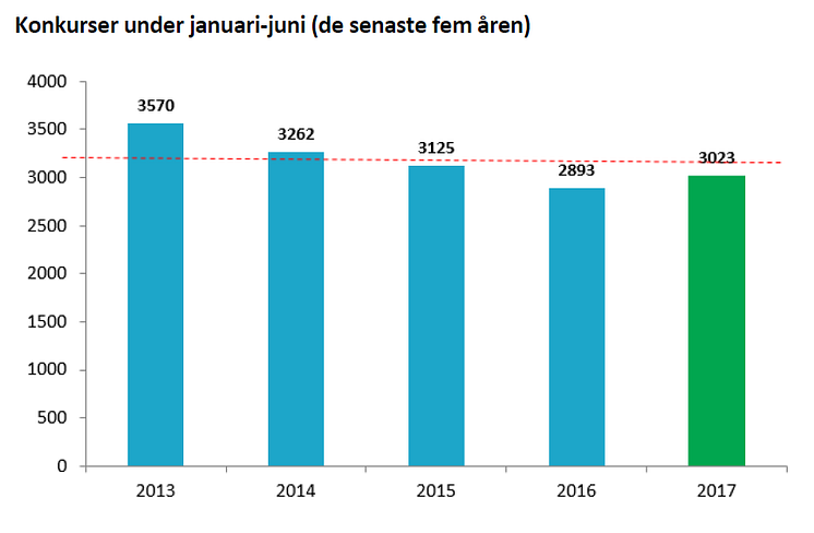 Medelvärdet sett över en tioårsperiod är 3 110 konkurser de sex första månaderna, vilket kan jämföras med årets siffra på 3 023 konkurser. Sett till senaste fem åren så är samma siffra 3 175.