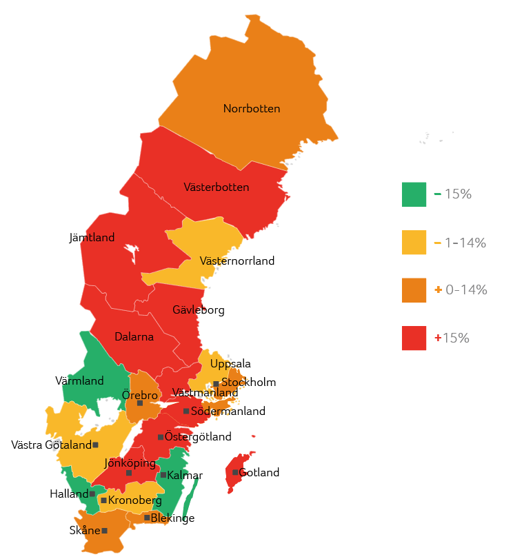 Allra bäst har det gått för Värmland (-45%) som nästan halverat antalet konkurser under första halvåret. Även Kalmar (-23%) och Halland (-20%) uppvisar stora minskningar i antalet konkurser. Störst uppgång finns i Västmanland med (+132%), Gotland (+73%) och Dalarna (56%).