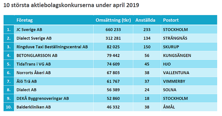 Företagskonkurserna under april landade på 517 aktiebolag, en ökning på tre procent. Det är flera stora företag och väletablerade varumärken som gått i graven. Största konkurserna denna månad är modekedjan JC Sverige AB, telefoniföretaget Dialect samt ett av Skånes största taxibolag, Ringduve Taxi. Totalt drabbades 2 283 anställda när deras arbetsgivare försattes i konkurs - en ökning med 64 procent.