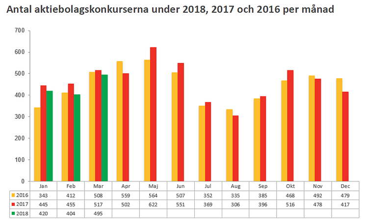 - Antal aktiebolagskonkurser under 2016, 2017 och 2018 uppdelat per månad