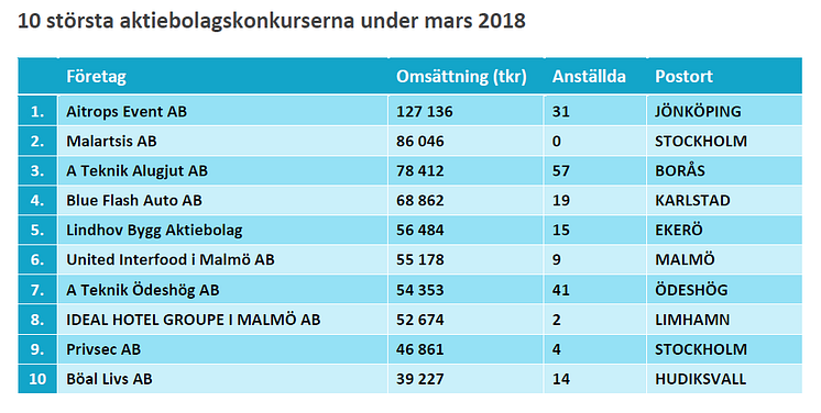 10 största aktiebolagskonkurserna under mars 2018