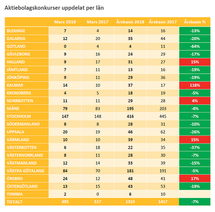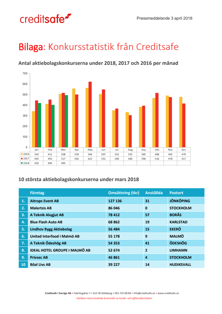Konkursstatistik per den 3 april 2018, se bilaga som omfattar:
