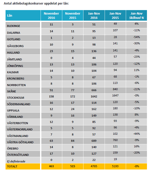 För konkursstatistik per den 1 december 2016, se bilaga som omfattar:
