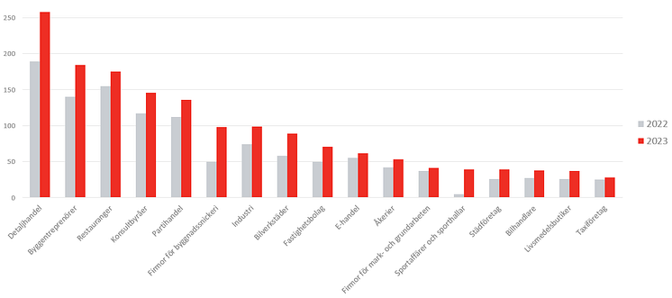 Branscher med högst procentuell ökning: Sportaffärer och sporthallar (680%), Firmor för byggnadssnickeri (96%), Bilverkstäder (53%) och Städföretag (50%). Majoriteten av konkurserna sker inom: Detaljhandel (37%), Byggentreprenörer (31%), Restauranger (13%) och Konsultbyråer (25%).