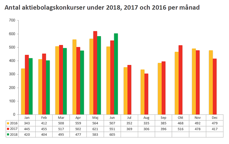 Totalt registrerade 605 konkurser under juni. Jämfört med förra årets siffra på 551 är det en uppgång med 10 procent. Efter åtta månader i rad med sjunkande antal konkurser ökar nu konkurserna för första gången på länge i Sverige.