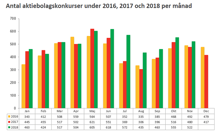 - Antal aktiebolagskonkurser under 2016, 2017 och 2018 uppdelat per månad