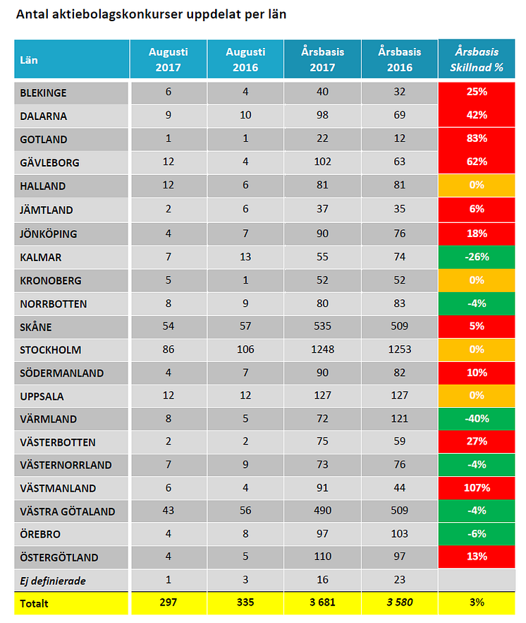 För konkursstatistik per den 1 september 2017, se bilaga som omfattar: