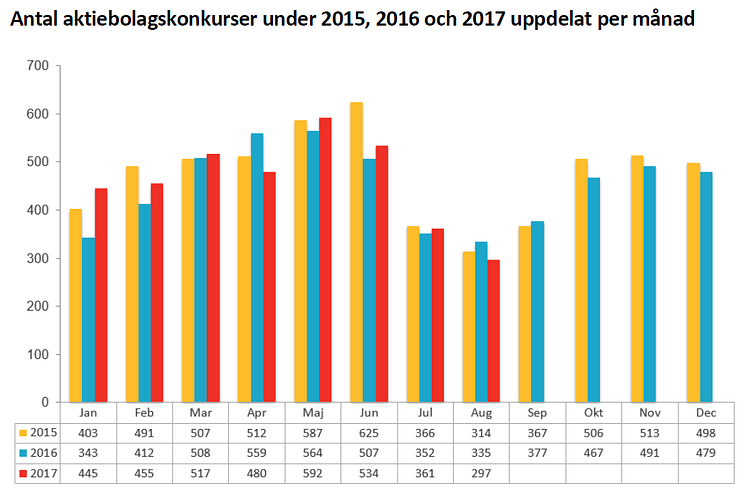 - Antal aktiebolagskonkurser under 2015, 2016 och 2017 uppdelat per månad