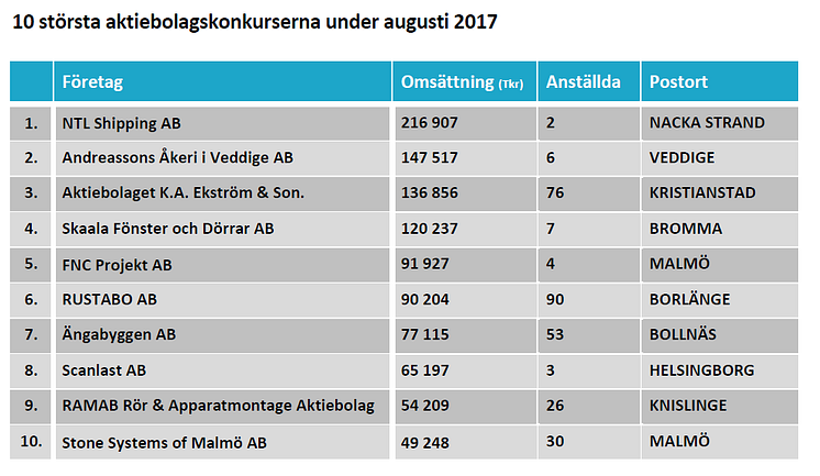 10 största aktiebolagskonkurserna under augusti 2017
